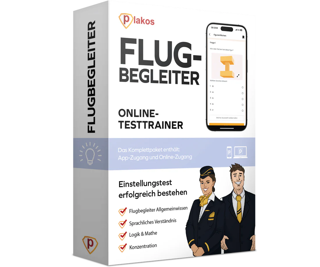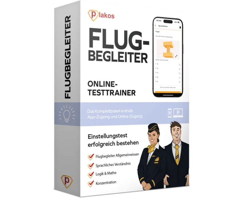 Um dich bestmöglich auf den Flugbegleiter Einstellungstest vorzubereiten, empfehlen wir dir unseren Flugbegleiter Online-Testtrainer. Hier findest du zahlreiche Übungsaufgaben, die genau auf die Anforderungen des Auswahlverfahrens abgestimmt sind – von Sprach- und Logiktests bis hin zu Konzentrations- und Persönlichkeitstests. Dank realistischer Testsimulationen trainierst du unter echten Prüfungsbedingungen und kannst deine Fortschritte jederzeit verfolgen. Starte jetzt mit der Vorbereitung und sichere dir den entscheidenden Vorteil für deinen Traumjob in der Luft!